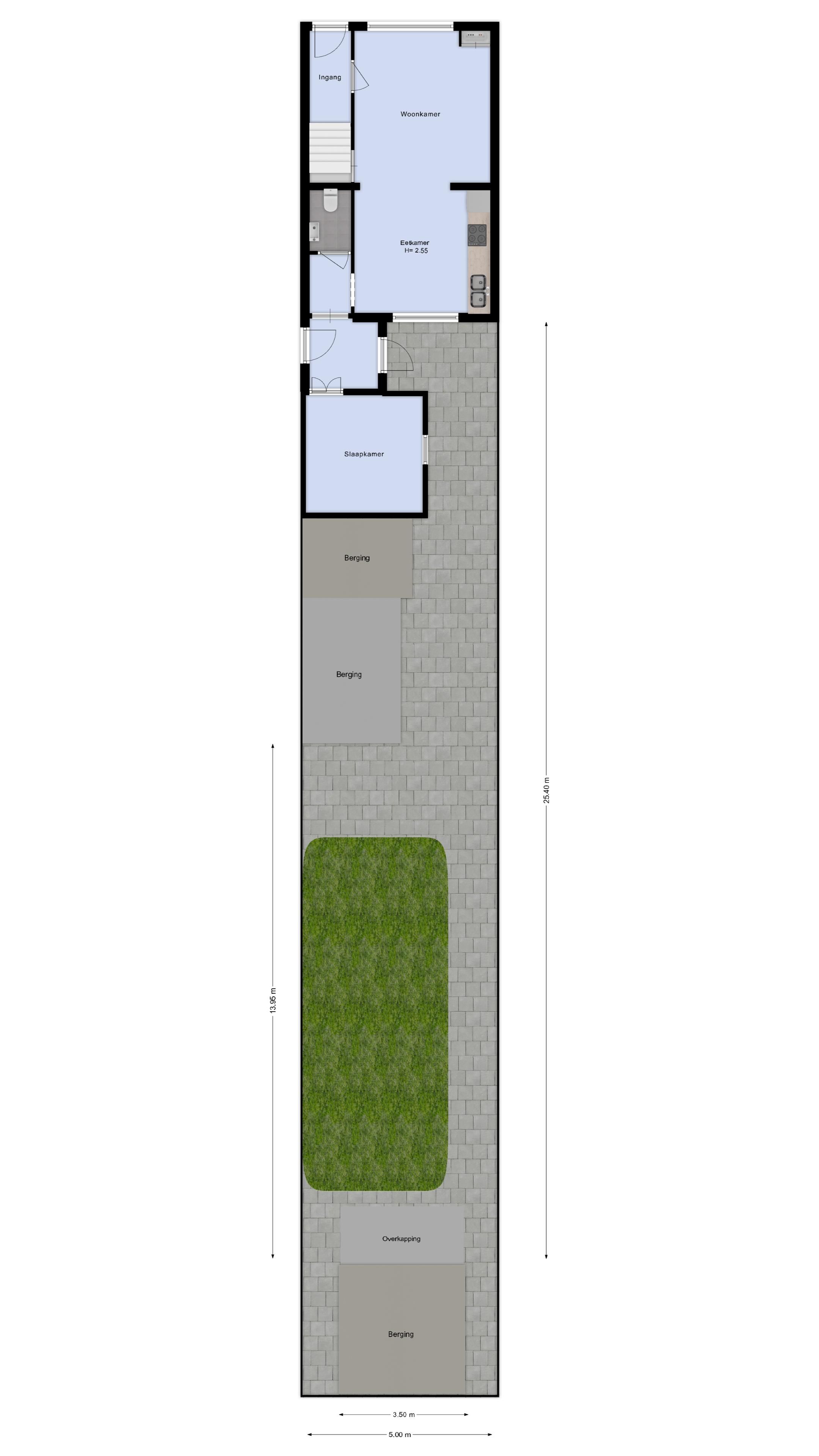 | Kiemas laukia | 100 m2 (20,00 meter diep en 5,00 meter breed) |